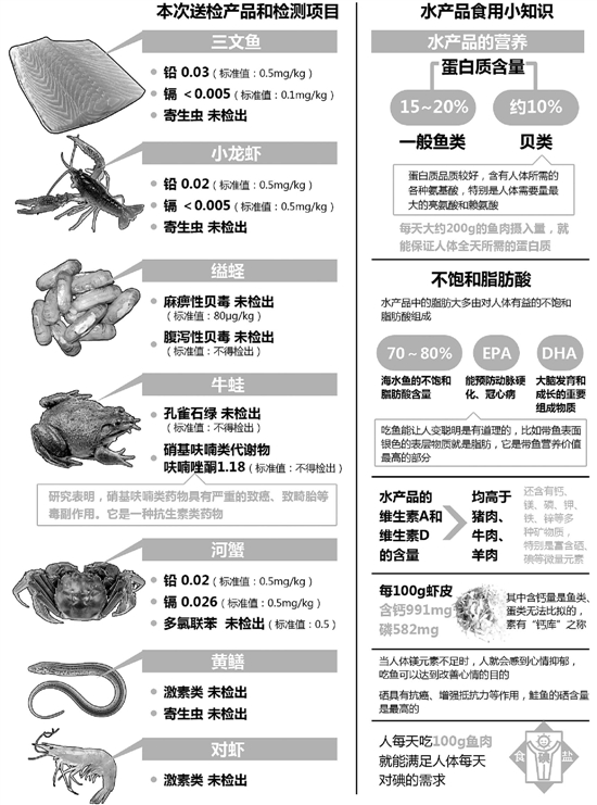 上周,浙江省海洋与渔业局、浙江省水产质量检测中心联合钱江晚报发起了“你点我检”水产品质量安全公益检测活动,我们邀请到7位杭州市民,从市场随机购买了三文鱼、小龙虾、缢蛏、牛蛙、河蟹、黄鳝和对虾这7种水产品,分别进行了重金属、寄生虫、违禁药物、激素、毒性等的检测。
