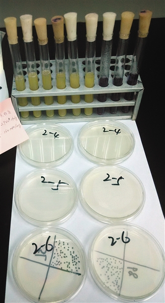 实验过程:以无菌操作将生鲜奶分别称取两份25g样品,放入盛有225ml稀释液的无菌生理盐水中,制成1:10、1:100的样品匀液。将两种溶液样品放置在培养基中,常温下培养菌落24小时以上。